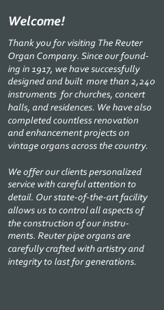 The Reuter Organ Company Welcomes You. With over ninety-five years of pipe organ building experience, we have successfully designed and constructed more than 2,240 pipe organs for churches, concert halls, and residences. We offer our clients personalized service with careful attention to detail. Our state-of-the-art facility allows us complete control of the design and construction of all elements of our instruments. Reuter pipe organs--church organs, concert organs, and residence organs -- are carefully crafted with artistry and integrity to last for generations.