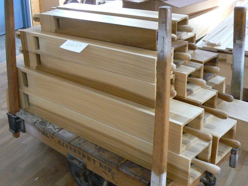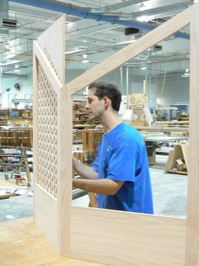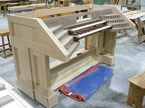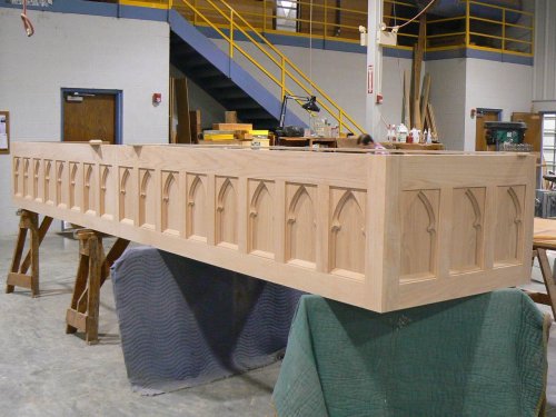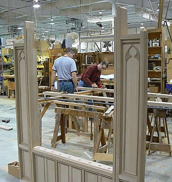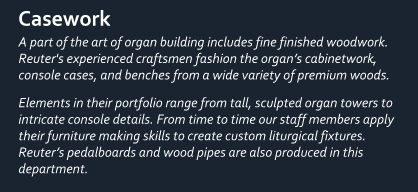 Casework – A part of the art of organ building includes fine finished woodwork. Reuter's experienced craftsmen fashion the organ’s cabinetwork, console cases, and benches from a wide variety of premium woods. Elements in their portfolio range from tall, sculpted organ towers to intricate console details. From time to time our staff members apply their furniture making skills to create custom liturgical fixtures. Reuter’s pedalboards and wood pipes are also produced in this department.