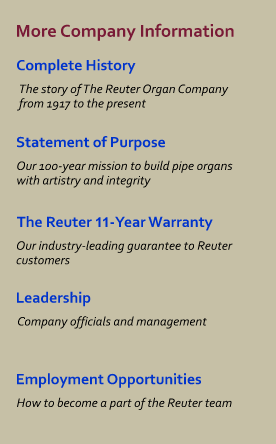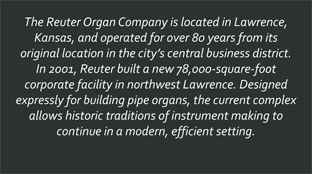 The Reuter Organ Company is located in Lawrence, Kansas, and operated for over 80 years from its original location in the city's central business district. In 2001, Reuter built a new, four-million-dollar corporate facility in northwest Lawrence. Designed expressly for building pipe organs, the current complex allows historic traditions of instrument making to continue in a modern, efficient setting.