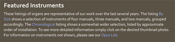 Featured Instruments These listings of pipe organs are representative of our work over the last several years. The listing By Size shows a selection of instruments of four manuals, three manuals, and two manuals, grouped accordingly. The Chronological listing shows a somewhat wider selection, listed by approximate order of installation. To see more detailed information simply click on the desired thumbnail photo. For information on instruments not shown, please see our Opus List. Featured Instruments, by Size Featured Instruments, Chronological Listing