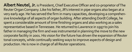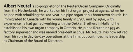 Reuter Management Albert Neutel is co-proprietor of The Reuter Organ Company. Originally from the Netherlands, he worked on his first organ project at age 11, when he helped with rebuilding the 200-year-old pipe organ at his hometown church. He immigrated to Canada with his young family in 1955, and by 1960, with experience he had gained working with the Dekker Brothers in Holland, he established his own organ company in Ontario. He joined Reuter in 1979 as factory supervisor and was named president in 1983. Mr. Neutel has now retired from his role in day-to-day operations at the firm, but continues his leadership as Chairman of the Board of Directors.
