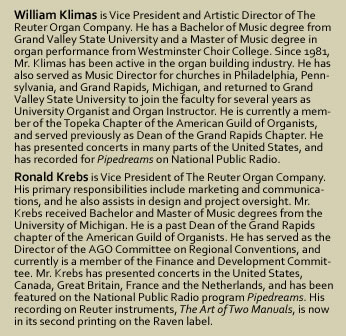 William Klimas is Vice President and Artistic Director of the Reuter Organ Company. He has a Bachelor of Music degree from Grand Valley State University and a Master of Music degree in organ performance from Westminster Choir College. Since 1981, Mr. Klimas has been active in the organ building industry. He has also served as Music Director for churches in Philadelphia, Pennsylvania, and Grand Rapids, Michigan, and returned to Grand Valley State University to join the faculty for several years as University Organist and Organ Instructor. He is currently a member of the Topeka Chapter of the American Guild of Organists and served previously as Sub-Dean and Dean of the Grand Rapids Chapter. He has presented concerts in many parts of the United States, and has recorded for Pipedreams on National Public Radio.