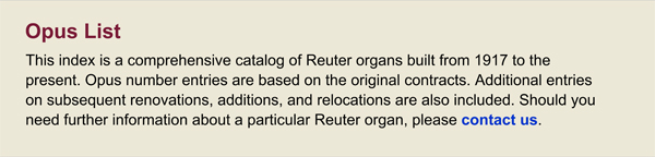 Opus List This index is a comprehensive catalog of Reuter organs built from 1917 to the present. Opus number entries are based on the original contracts. Additional entries on subsequent renovations, additions, and relocations are also included. Should you need further information about a particular Reuter organ, please contact us.