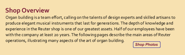 Pipe organ building is a team effort, calling on the talents of design experts and skilled artisans to produce elegant musical instruments that last for generations. The depth of knowledge and experience in the Reuter shop is one of our greatest assets. Half of our employees have been with the company at least 20 years. The following pages describe the main areas of Reuter operations, illustrating many aspects of the art of organ building.