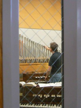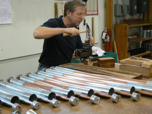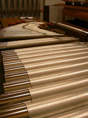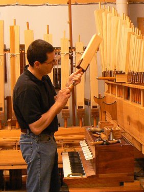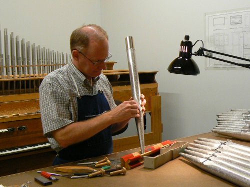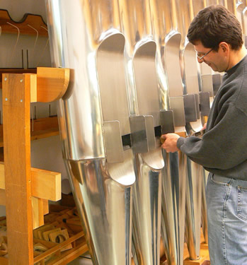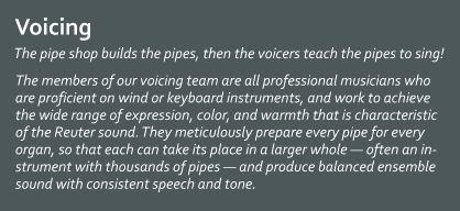 Voicing – The pipe shop builds the pipes, then the voicers teach the pipes to sing! For 21 years, Tom Watgen has been working with pipes to achieve the wide range of expression, color and warmth that is characteristic of Reuter organs. He is in charge of a team of voicers who are all musicians and proficient on wind or keyboard instruments. They painstakingly prepare every pipe for every organ, so that each can eventually take its place in a much larger ensemble—often an instrument with thousands of pipes—and produce beautiful, balanced sound with consistent speech and tone.
